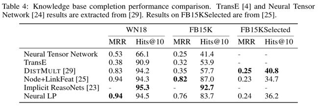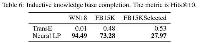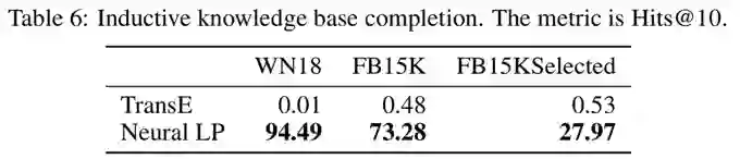 为了证明Neural LP的归纳推理的能力,本文还特别设计了一个实验,在训练数据集中去掉所有涉及测试集中包含的实体的三元组,然后训练并预测,得到结果如下: