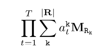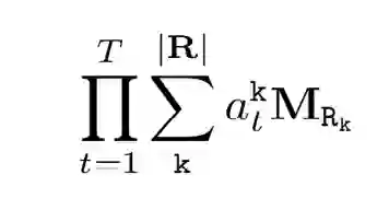 本文提出的NeuralP模型主要收到 TensorLog 的启发。TensorLog 可视为一个可微的推理机。知识库中的每个实体用一个 one-hot 向量表示,每个关系 r 定义为一个矩阵算子 M_r,M_r 为一个稀疏的毗连矩阵,维度为 n_e×n_e, 其中 n_e 表示实体的个数。每一条逻辑规则的右边部分被表示为以下形式:
