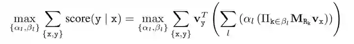 V_x 和 V_y 分别为一个由规则推理得到的三元组。在上式的优化问题中,算法需要学习的部分分为两个:一个是规则的结构,即一个规则是由哪些条件组合而成的;另一个是规则的置信度。由于每一条规则的置信度都是依赖于具体的规则形式,而规则结构的组成也是一个离散化的过程,因此上式整体是不可微的。因此作者对前面的式子做了以下更改: