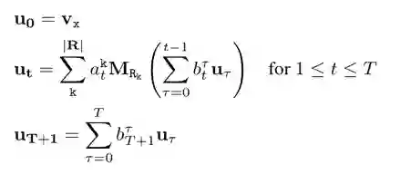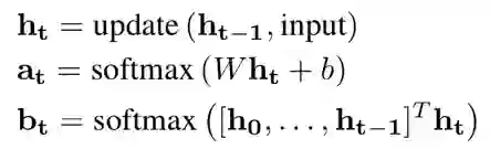 主要交换了连乘和累加的计算顺序,对预一个关系的相关的规则,为每个关系在每个步骤都学习了一个权重,即上式的 a_l^k。其中 T 为超参,表示规则的长度。由于上式固定了每个规则的长度都为 T,这显然是不合适的。为了能够学习到变长的规则,Neural LP中设计了记忆向量 u_t,表示每个步骤输出的答案--每个实体作为答案的概率分布,还设计了两个注意力向量:一个为记忆注意力向量 b_t ——表示在步骤 t 时对于之前每个步骤的注意力;一个为算子注意力向量 a_t ——表示在步骤 t 时对于每个关系算子的注意力。每个步骤的输出由下面三个式子生成:
