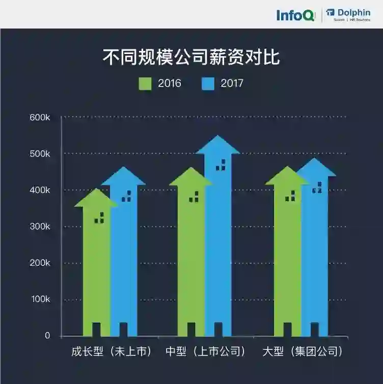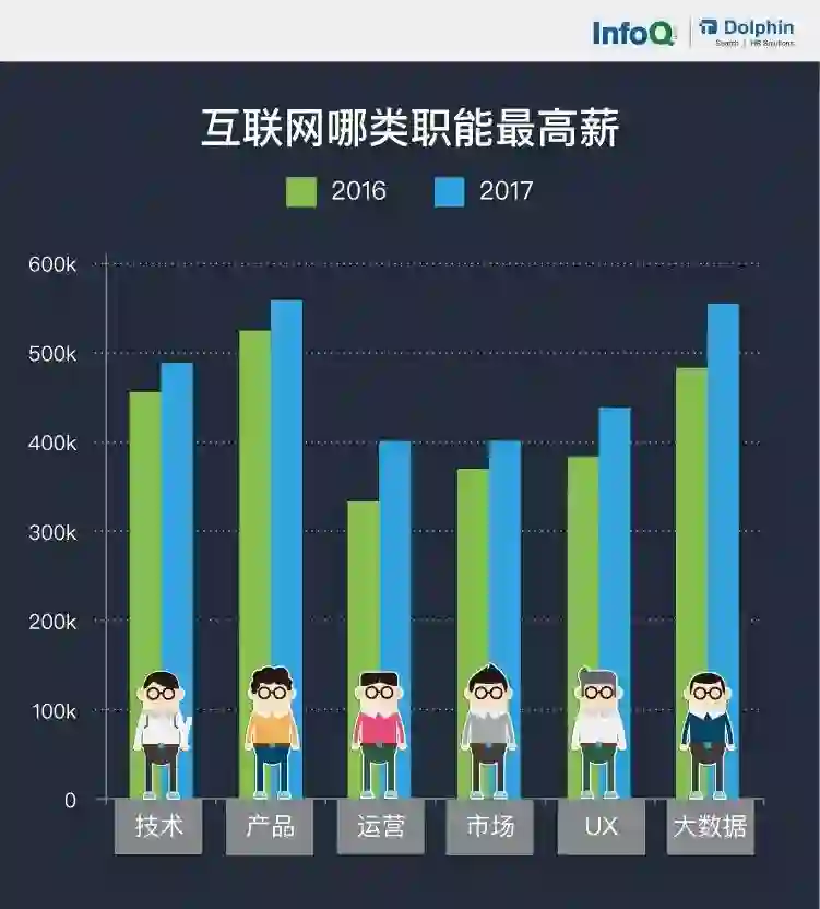 2017 年技术高端,Java 和架构师候选人的薪资与去年基本持平,运维,前端和大数据增长比较明显,而移动开发和 PHP 则有所降低。