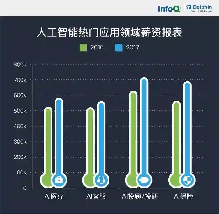 2017 年是人工智能人才招聘需求爆发的元年,行业的大牛和 AI 团队的负责人目前也是一将难求,初/中级人才有大量其他相关领域的人才涌入,填补了大部分的需求,他们会更看重积累项目经验对以后职业发展的价值,薪资希望也和市场正常涨幅持平,导致整个 AI 领域的平均薪资水平并没有高出市场水平太多。