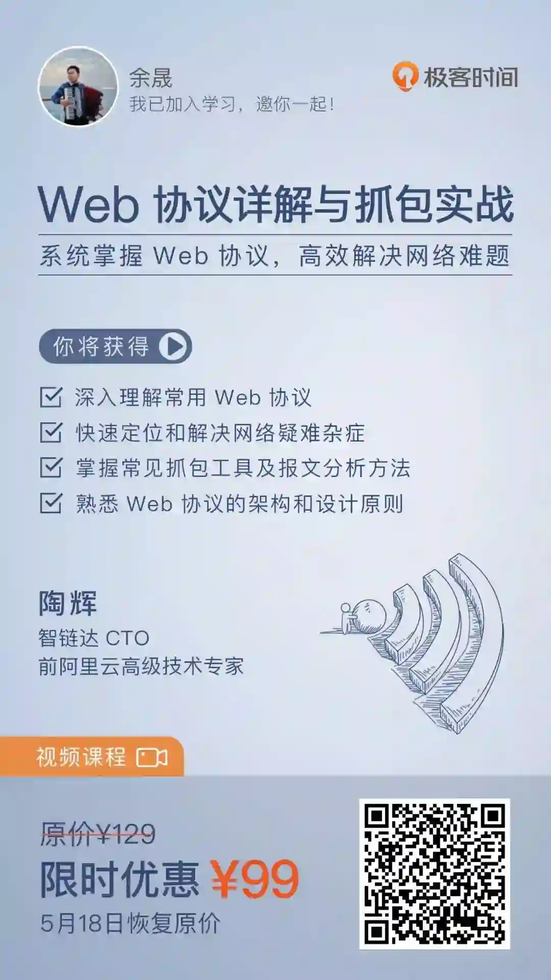在《Web 协议详解与抓包实战》视频课中,陶辉老师会把自己十几年积累的第一手经验毫无保留地分享给大家。