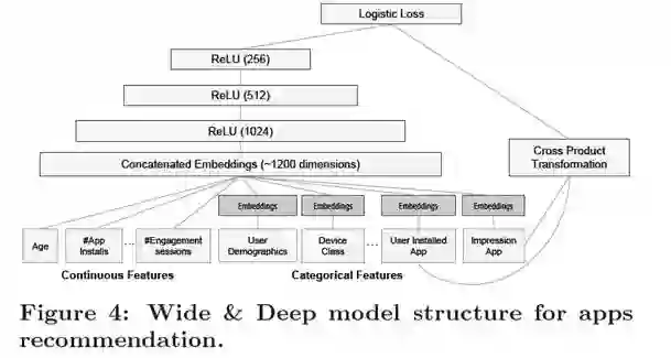 Figure1最右侧结构是一个3个hidden layer的MLP,其将类别特征(categorical feature),如安装了视频类应用,展示的是音乐类应用等,将这些高维稀疏的类别特征映射为低维稠密的向量(Dense Embeddings)。与其他连续特征(用户年龄、应用安装数等)拼接在一起,输入 MLP 中。