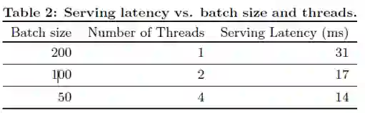 seving performance:工程现采用并行, 并使用较小的batch满足推荐引擎的高并发与低延迟的需求。实验效果见Table2: