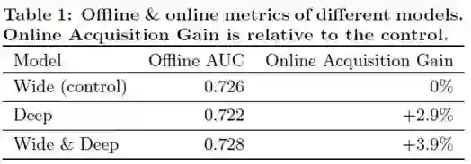 app acquisitions:通过对1%的a线上用户进行A/B testing,Wide&Deep效果明显, 线下实现效果提升不大的原因可能是线下的实验数据是固定的, 限制了模型的泛化能力。实验效果见Table1:
