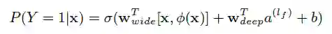 其中,Y 是二值类标签,表示用户是否下载app的行为。为sigmoid函数, 为Wide Component中构造的cross-product transformation,x为app item对应的原始特征,b为偏置。Wwide 与 Wdeep分别为两个模型的参数向量。
