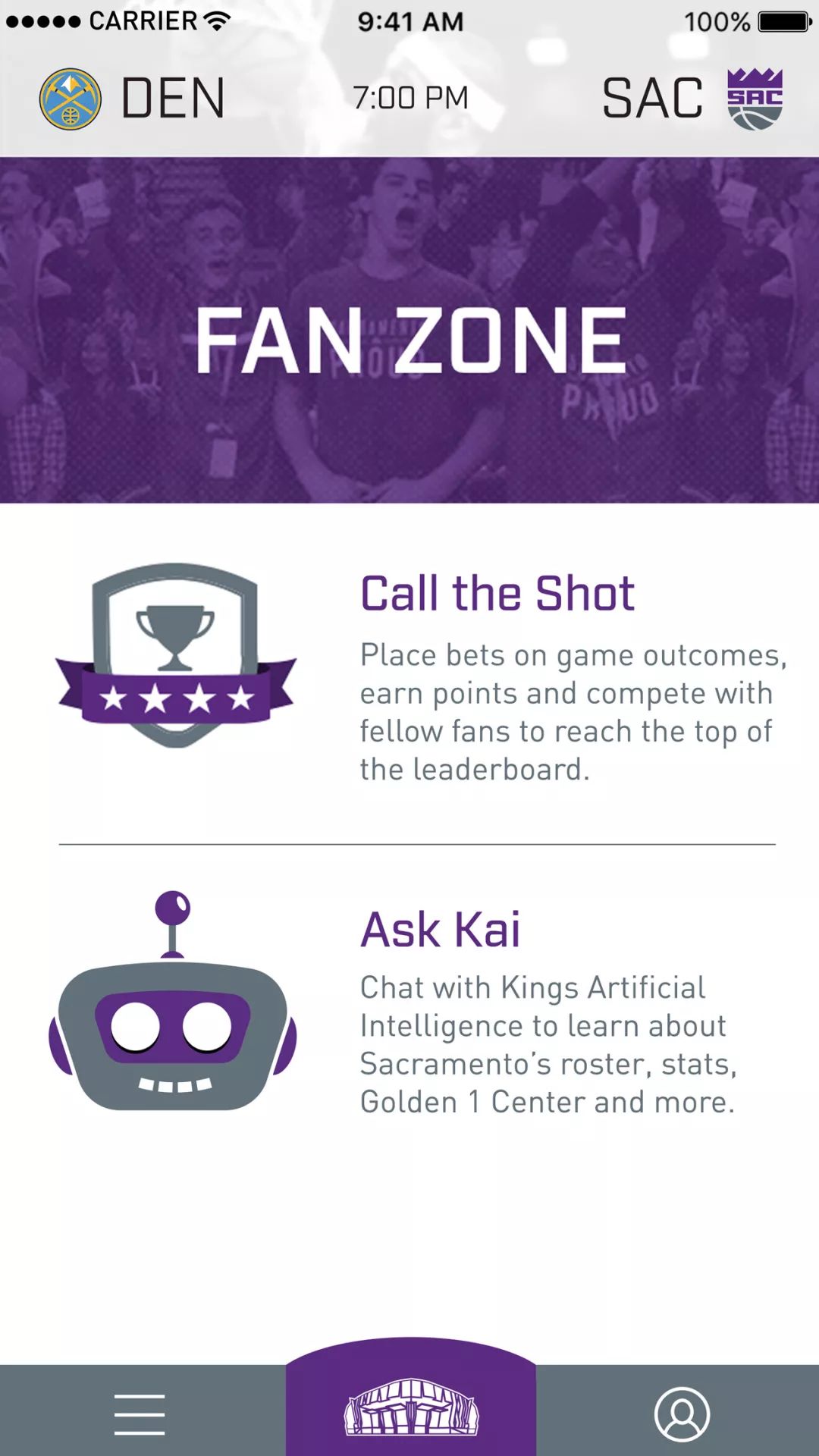 2016 年 6 月,Sacramento Kings 篮球队与定制机器人开发 Sapien 公司合作,推出了一款名为 KAI 的聊天机器人,取意于 Kings Artificial Intelligence 的首字母缩写。