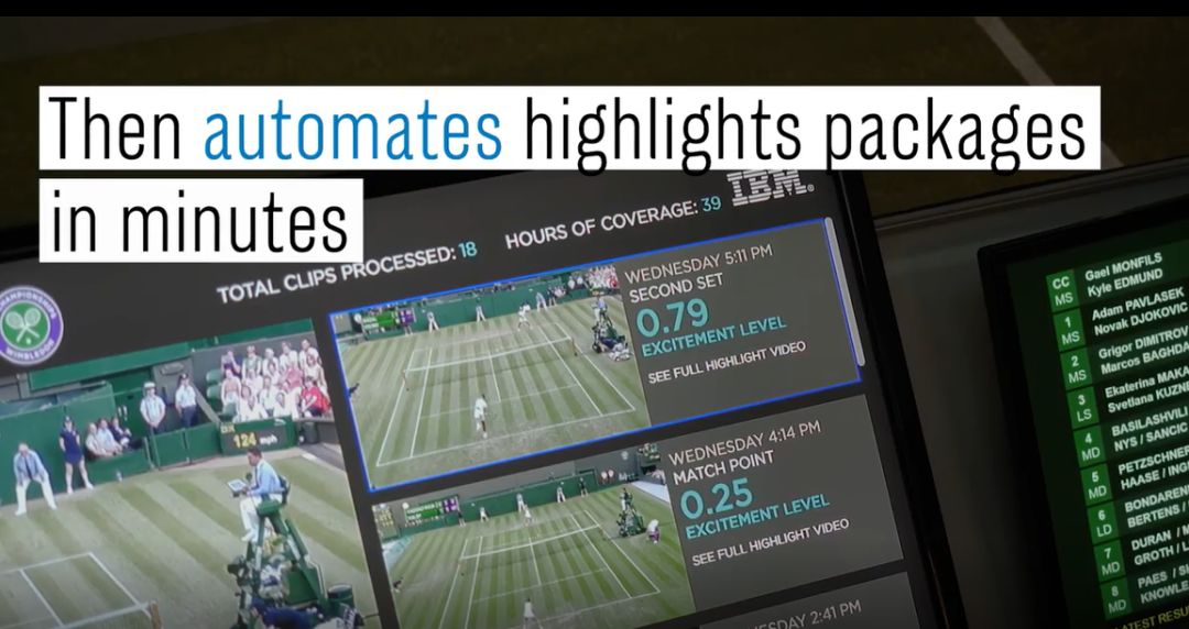 IBM 宣布从 2017 年开始通过 Watson 人工智能平台帮助新闻工作者们剪辑出比赛亮点合集,创造出“感知亮点”(Cognitive Highlights)。这些集锦将出现在温网比赛的数字频道中。