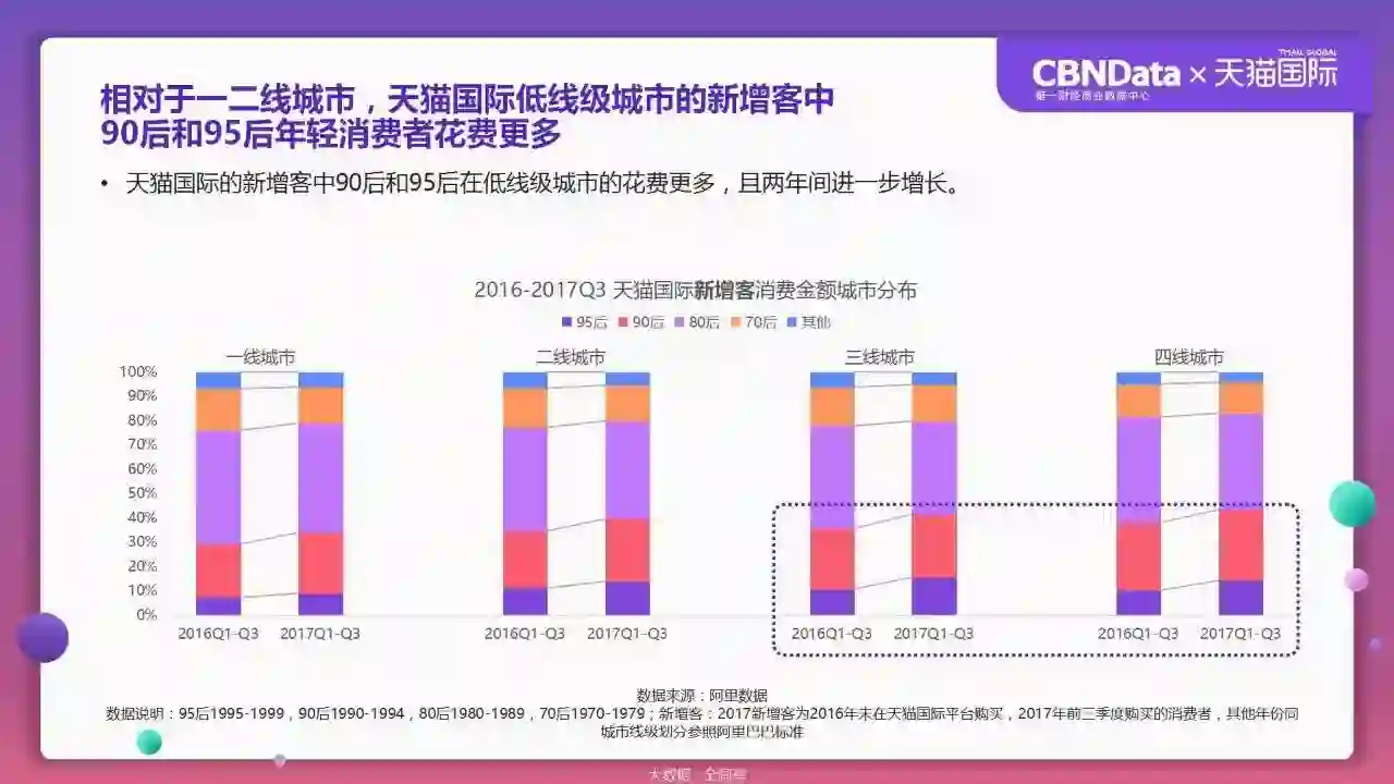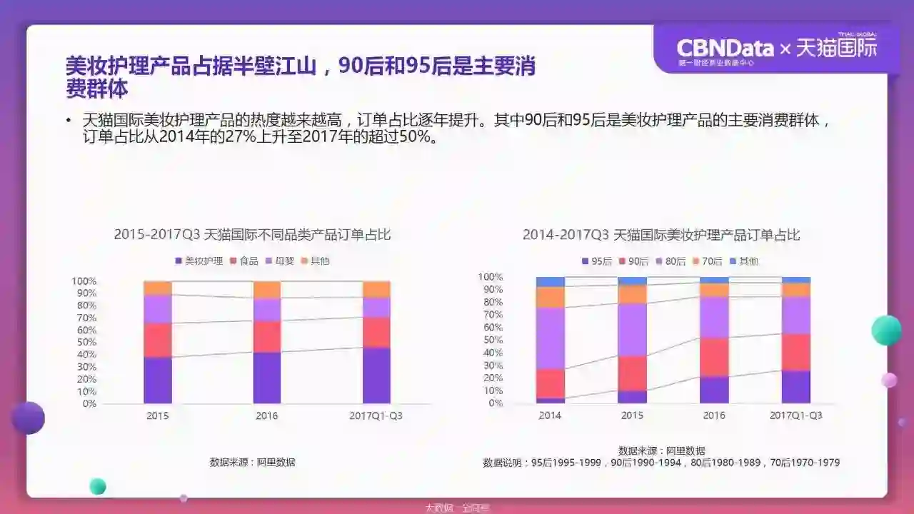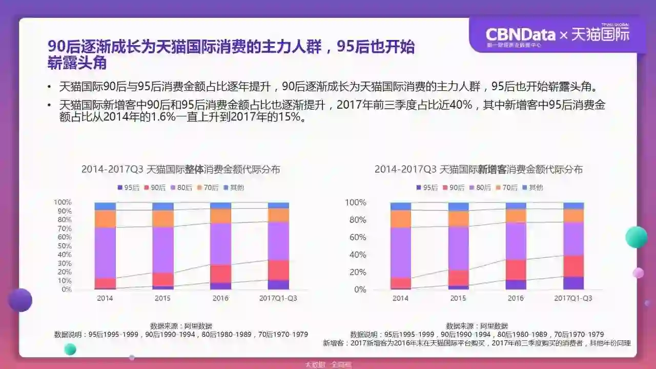 12月28日,第一财经商业数据中心(CBNData)联合天猫国际发布了《天猫国际跨境消费洞察报告——线上90、95后消费人群浅析》(以下简称为CBNData《报告》,点击阅读全文查看完整报告),以阿里巴巴2014年-2017年9月消费数据为基础进行分析,全方位洞察中国天猫国际发展趋势和用户行为特征,助力电商企业商业决策。