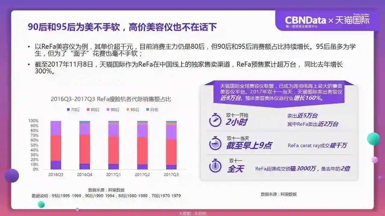 虽然至今为止,80后仍然是主力消费群体,但90后和95后的消费额占比从2016年Q3到2017年Q3持续增长,95后虽学生居多,但为“面子”毫不手软。
