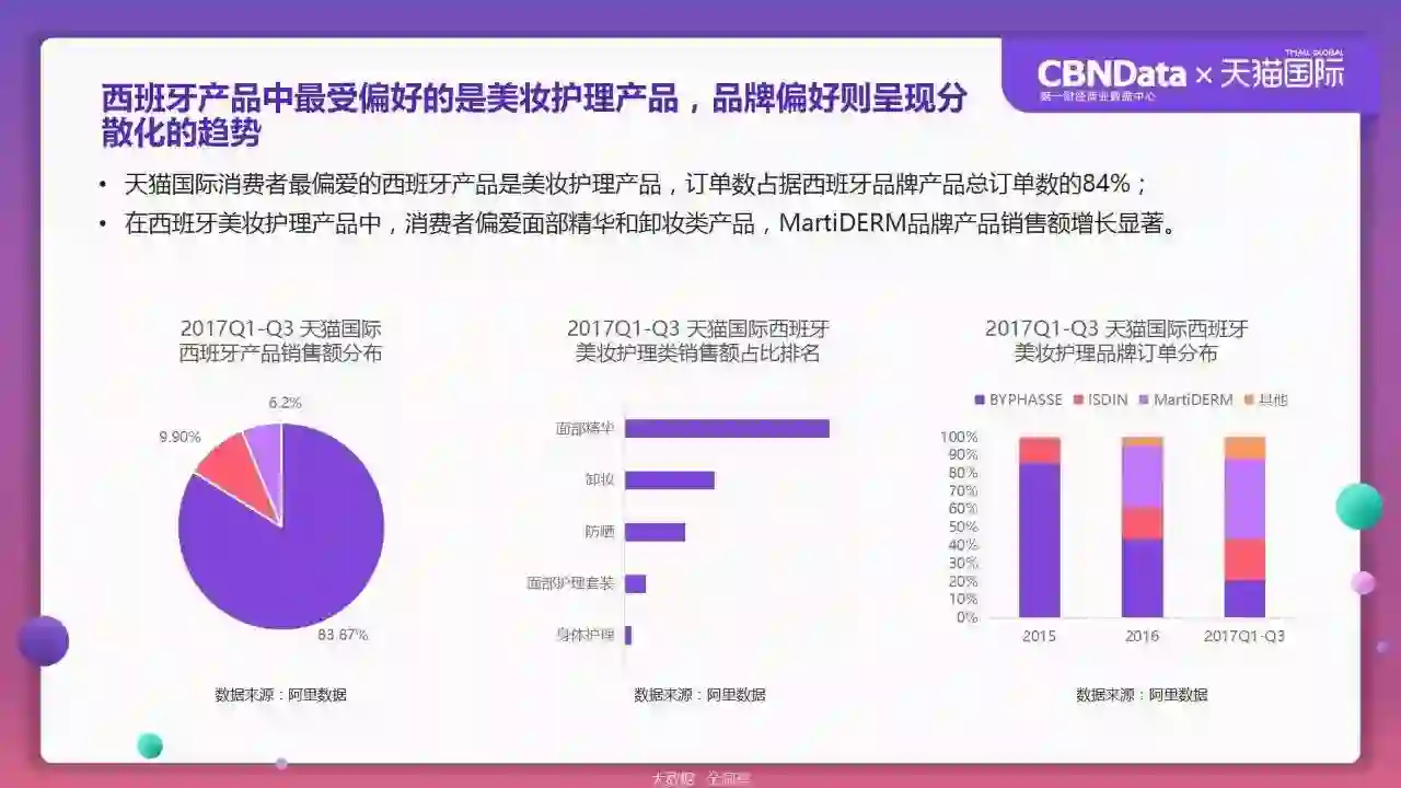 作为天猫国际消费者新晋的产品偏爱国别,西班牙品牌的美妆护理产品最受欢迎。CBNData《报告》显示2017年前三季度西班牙品牌的美妆护理产品订单数占据西班牙品牌产品总订单数的八成以上,其中MartiDERM销售额增长显著,而它家的安瓶精华属招牌产品。