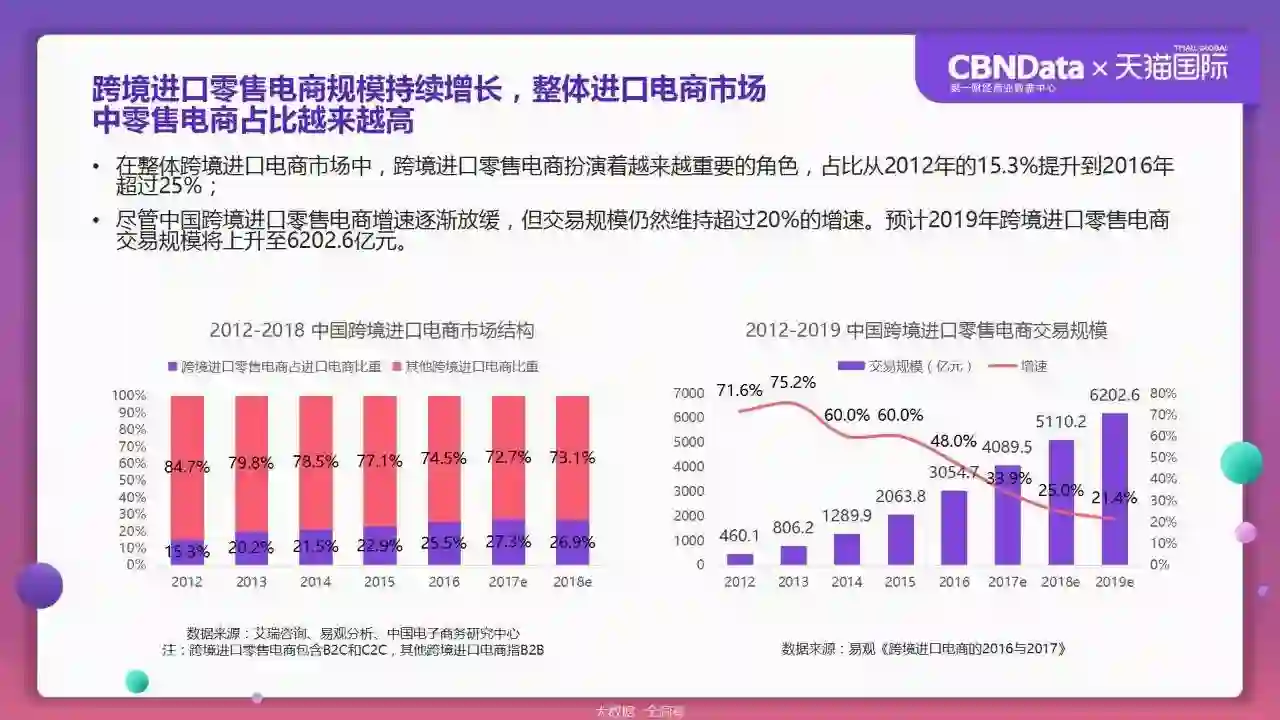 CBNData《报告》显示,在整体进口电商市场中,进口零售电商的重要性日益提升,占比从2012年的15.3%提升到超过25%。在中国跨境进口零售电商增速逐渐放缓的情况下,交易规模仍维持超过20%的增速,预计2019年跨境进口零售电商交易规模将上升至6202.6亿元。现阶段跨境进口零售电商市场75%以上为B2C综合电商平台,2017年第3季度天猫国际以25.4%的市场份额位居第一,京东全球购和网易考拉海购分别位居二、三位,三家总和占整体市场近60%的份额。