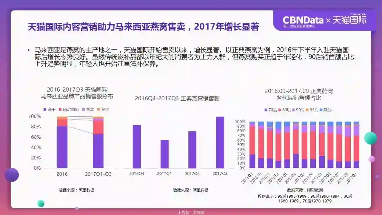 曾几何时燕窝是电视剧中贵妇的标配之一,而今不仅走进了大众的日常生活,更是加入了年轻人的滋补清单。根据CBNData《报告》显示,马来西亚作为燕窝的主产地之一,自天猫国际开始售卖以来,增长显著。以马来西亚正典燕窝为例,自2016年下半年入驻天猫国际后增长态势良好,从2016年9月到2017年9月按年龄段分布销售占比来看,90后销售额占比上升趋势明显,可见燕窝购买正趋于年轻化,年轻人也开始滋补保养。