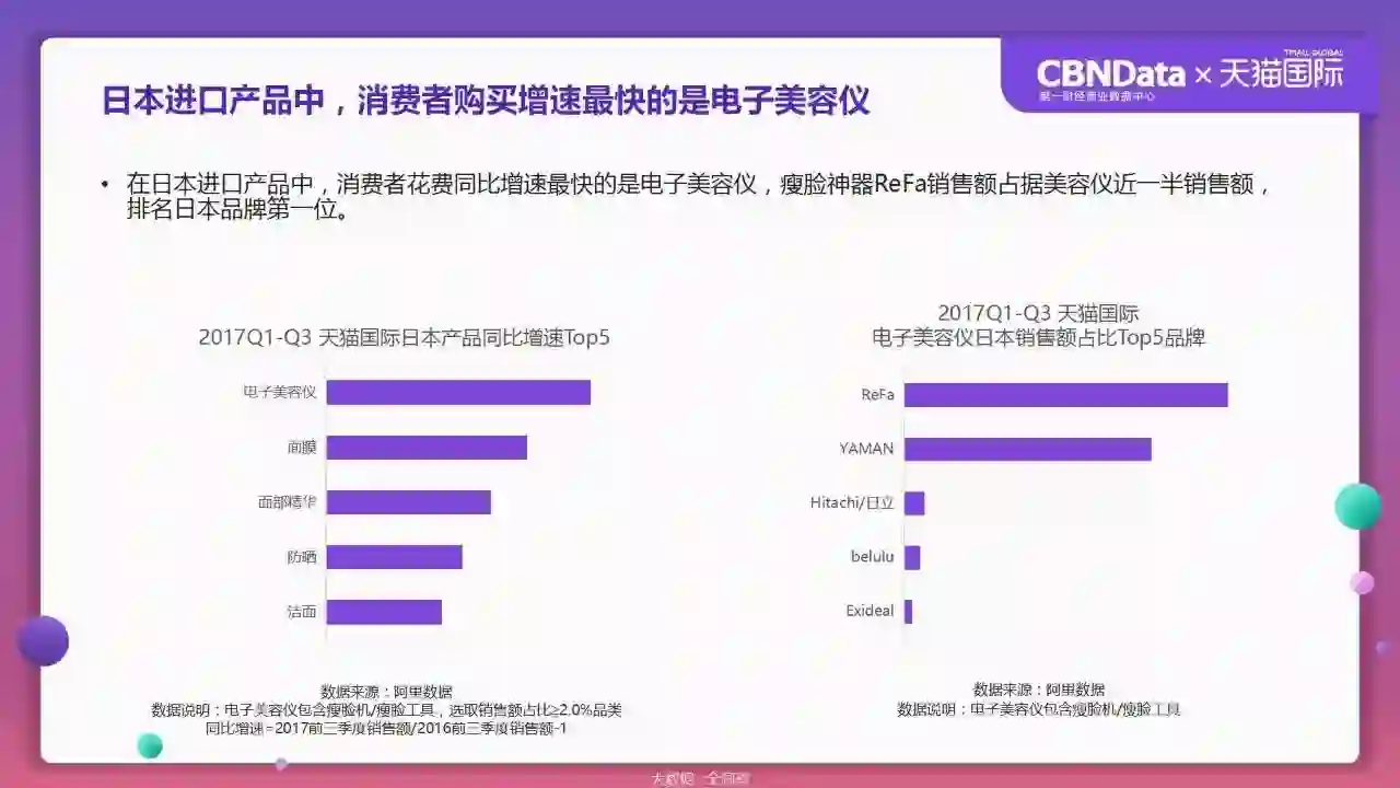 日本从2015至今一直是天猫国际平台上订单占比最大的国别,市场份额相对稳固,想必与日本品牌电子美容仪的走俏不无关系。2017年前三季度天猫国际的日本产品同比增速最快的是电子美容仪,其中日本ReFa美容仪销售额占据日本品牌美容仪整体近一半的销售额,当之无愧天猫国际上最受欢迎的日本美容仪品牌。截至11月8日,天猫国际作为ReFa中国线上独家渠道,其预售累计超万台,同比去年增长300%。