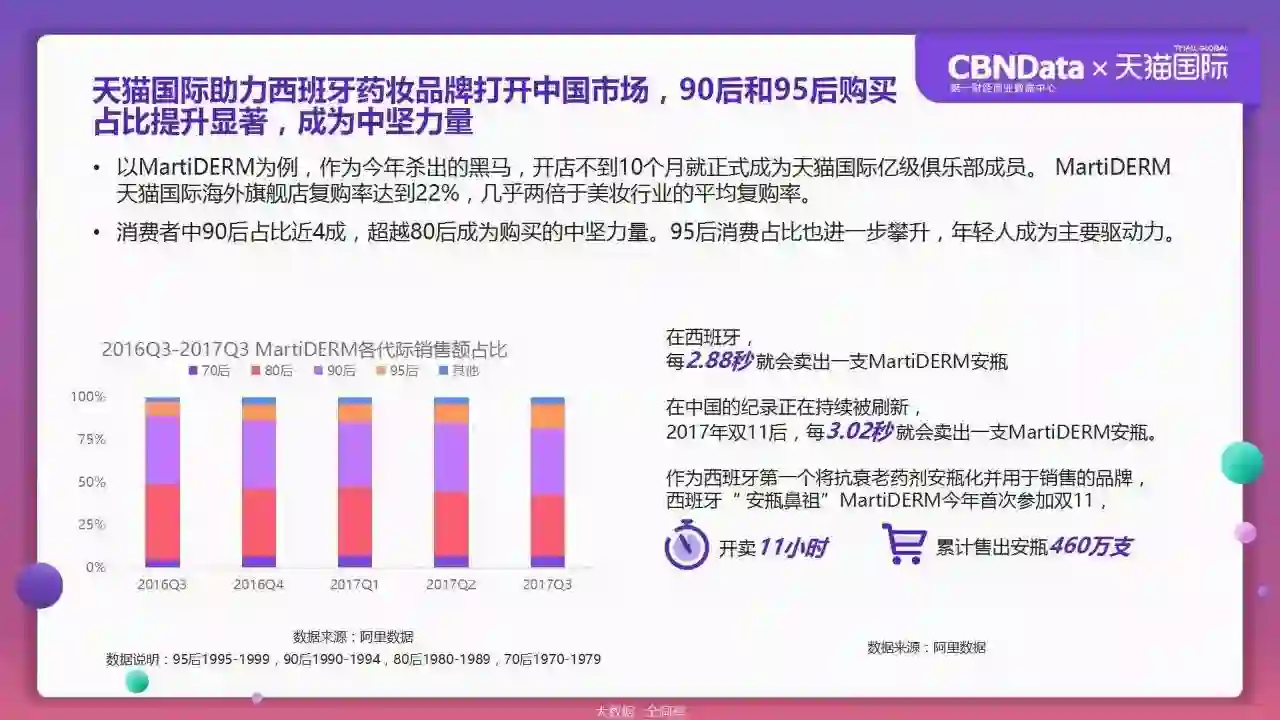 顶着西班牙“安瓶鼻祖”的头衔,MartiDERM海外旗舰店今年开店不到10个月就成为了天猫国际亿级俱乐部成员,复购率达到22%,几乎两倍于美妆行业的平均复购率。从2017年Q3的消费者按年龄分布来看,90后占比近4成,超越80后成为购买的中坚力量;而95后消费占比较2016年同期进一步攀升,让危“肌”无处遁形,谁还敢乱叫我们油腻青年!