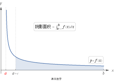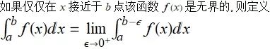 中 f 不是有界的: 当 x 在区间 [a,b] 内, 函数 f 在区间有一条垂直渐近线的时候, 函数会在渐近线附近变得很大, 且没有界限, 这就使该积分成了反常积分(improper).