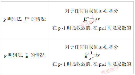 上面两种判别法基本策略都是选择一个能与函数 f 相比较的函数 g, 并且 g 相比 f 会更容易判别收敛性. 最常用的 g 函数是 x−p