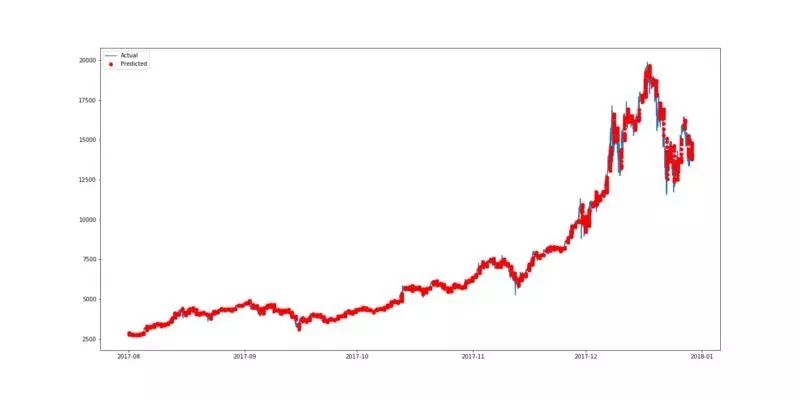 建立两个 Dataframe 用于比特币的市场实际价格和预测价格。出于可视化的目的,绘制的数字仅显示了 2017 年 8 月之后的数据。