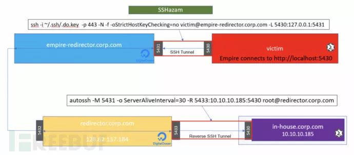 C2连接通过SSH隧道转发到empire-redirector。empire-redirector上的防火墙规则将流量转发到另一个中间重定向器。最后,Empire C2会话最终登陆的内部系统会建立与最终重定向器的反向SSH连接。