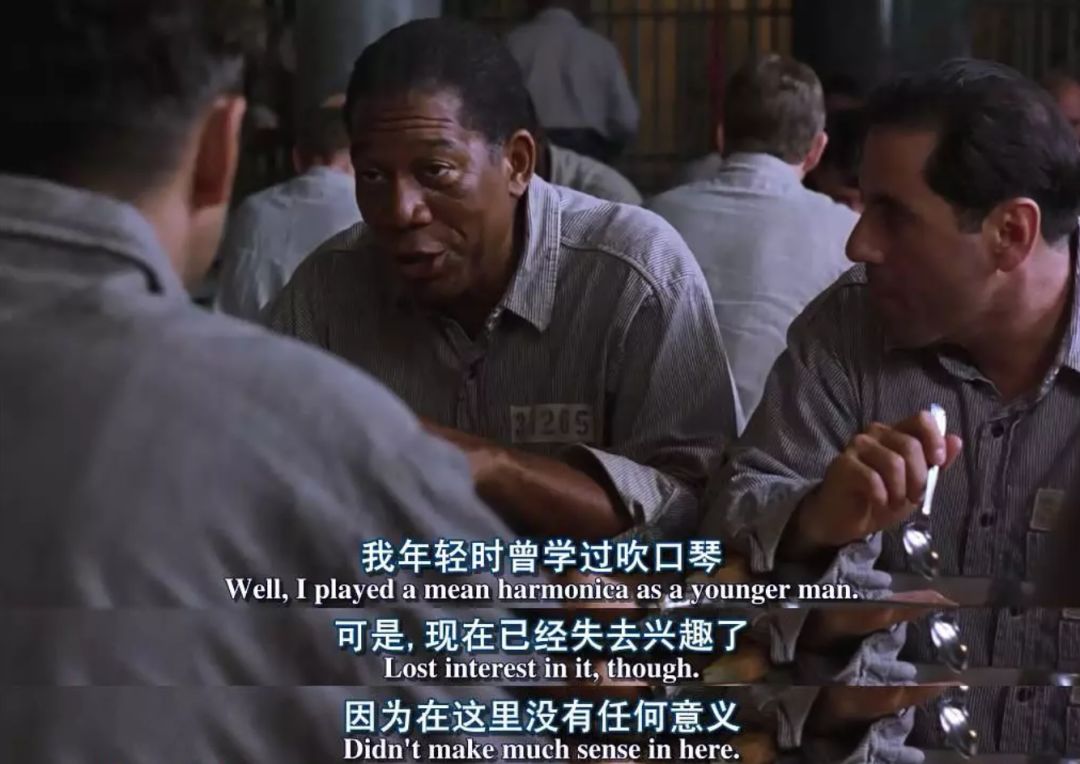 安迪因擅自广播音乐被关禁闭时,瑞德告诉他音乐在牢里没有意义。瑞德放弃了吹口琴的兴趣,其实就是丧失了生活的希望。