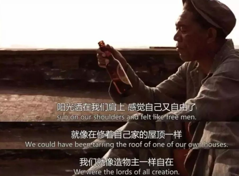 影片中有一幕,狱友们干完修缮屋顶的活后,安迪给大家争取来了啤酒。所有人都在屋顶上坐着歇息,大家笑着闹着,喝着冰啤酒。