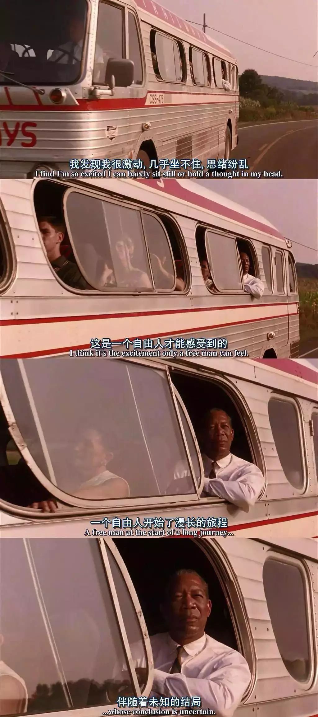 这时的瑞德坐在车上,迎着温暖的阳光,吹着自由的风,他激动地想:“只有一个踏上未知旅程的自由人才会这么激动吧。”