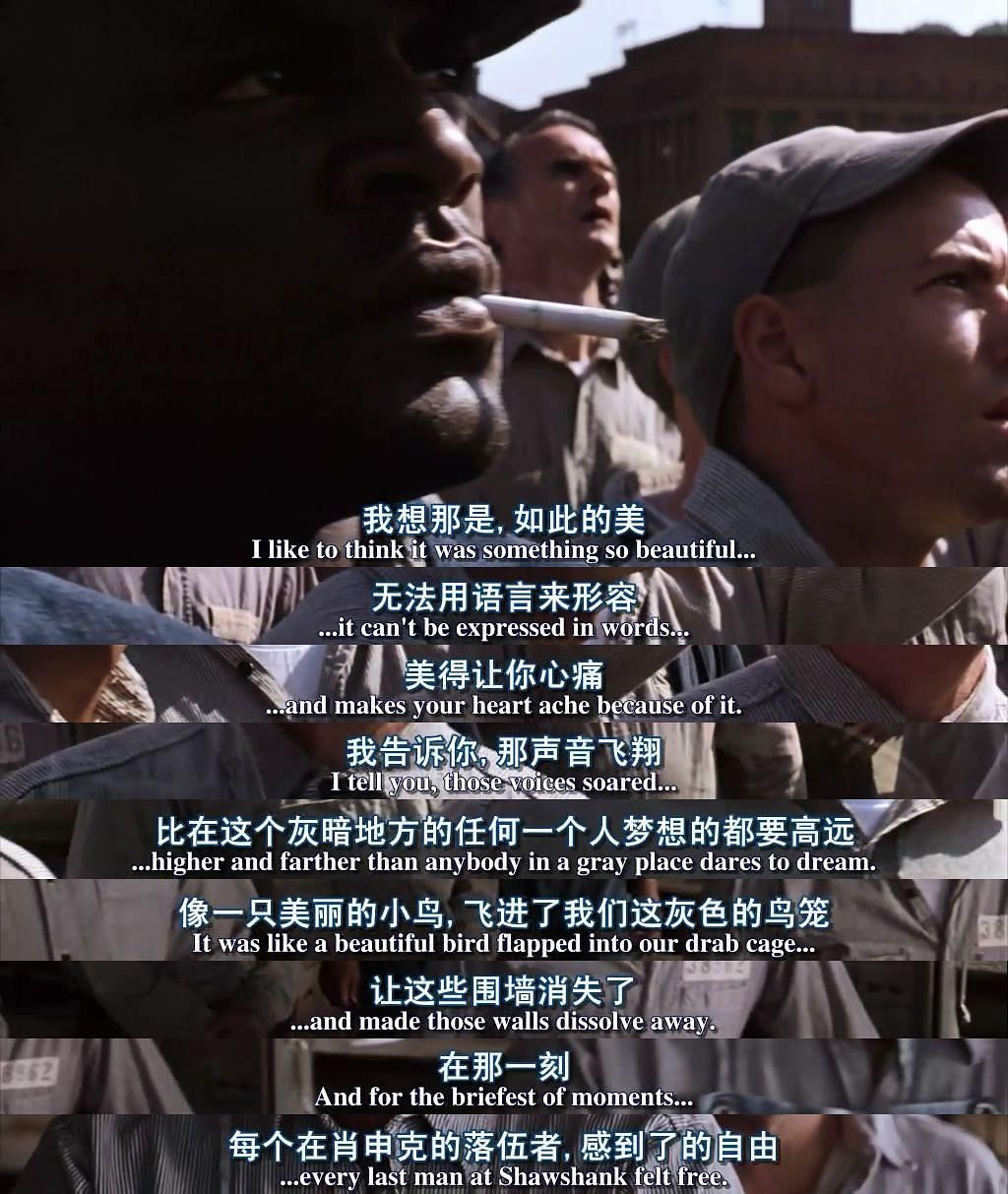 瑞德回忆道:“这些声音直插云霄,飞得比任何一个人敢想的梦还要遥远。就像一些美丽的鸟儿扑扇着翅膀来到了这个牢笼,让那些墙壁消失得无影无踪。就在那一刹那,肖申克监狱的每一个人都感到了自由。”