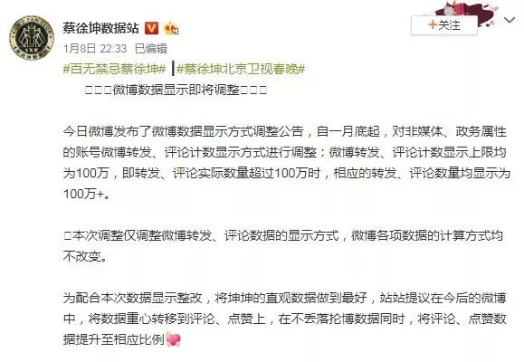 “设置100万的上限,当转发、评论实际数量超过100万时,相应的转发、评论数量均显示为100万+。”1月8日,@微博管理员发布了一条《关于调整微博转发评论数据显示方式的公告》,在饭圈引起了“轩然大波”。