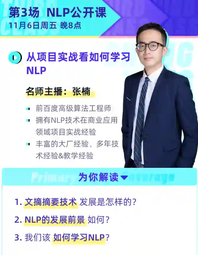 我们这门公开课带你深度解读NLP技术的发展以及当前所存在的难点,让学的一知半解的人,快速掌握自己的学习方向。让你在学习知识的分叉口上有一个正确的选择。你将收获对NLP知识体系化的理解。已经在某一领域有基础的人,可以了解其他领域在做什么,一边匹配交叉学习的需求。