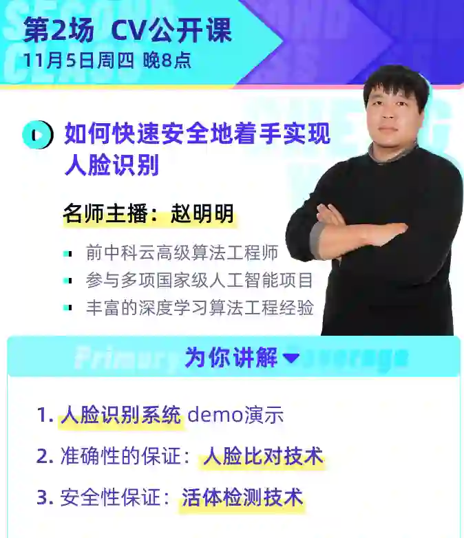 本次公开课可以让你全面了解人脸识别研发工作的整套流程,掌握一个人脸识别demo的快速开发方法,并且深度解读活体检测技术。