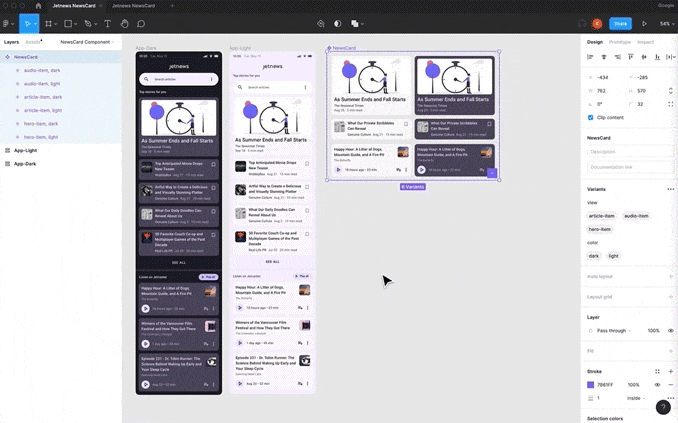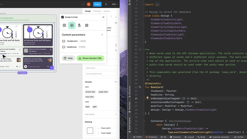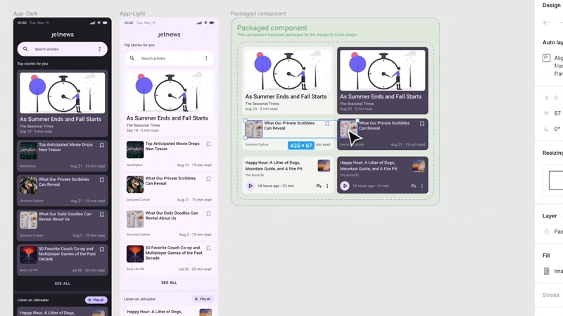 在我们定义的新工作流中,设计师首先在 Figma 中构建出产品使用的界面组件,Figma 提供了一套强大的组件模型,在此基础上我们利用插件进一步添加了用于交互和数据展示的注解。这一套工作流最终会创建出一个 UI Package,开发者可以直接将其作为可组合项导入到 Android Studio 中进行使用,且这套 UI Package 对设计师设计出来的界面进行了精准还原,使得我们可以快速地将组件集成到代码中去。