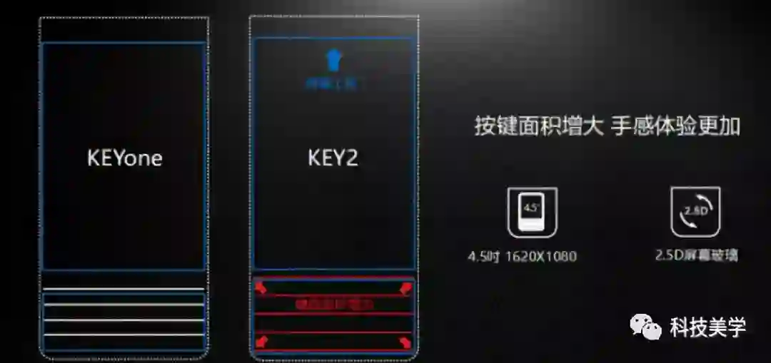 黑莓KEY2延续采用了经典的黑莓U字型外型,商务范儿满满,重新设计且极具效率的QWERTY全键盘,单粒键盘面积增大约20%,全新PVC触感再次升级按键体验。