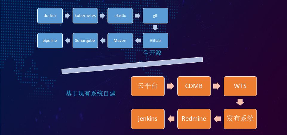 在开发处,开发人员可能会用到一些全开源的平台,如 Jenkins。由于它是完全开源,且未经改造过,那么其包含的各种运营规范和一些名字的标识,是无法与我们的业务树相对应的。这些无不增加了改造的难度。