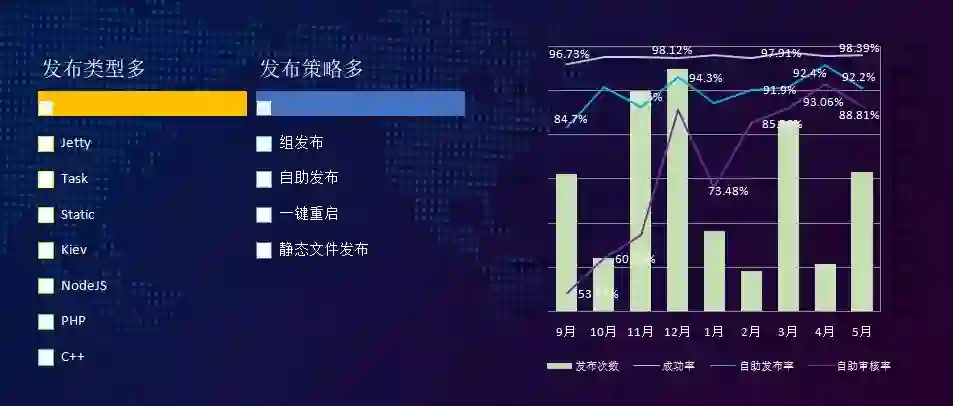 如图所示,我们发布的成功率一直都能保持在 98% 以上,而我们的自助发布率也是在持续增长中。在发布的过程,我们有超过 90% 的业务不需要运维的参与。