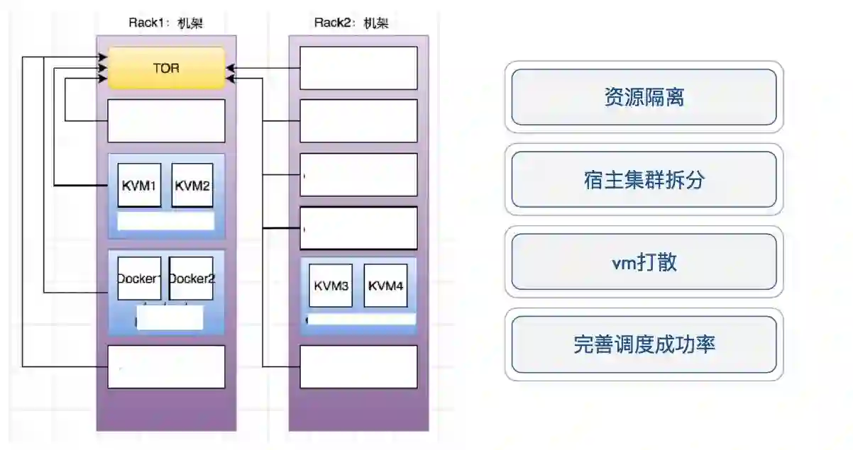 针对这个问题,我们做了两点,一个是对所有的网络资源都做了隔离,针对每个VM作相应的配额,另外一个是针对业务特性将宿主集群做了拆分。离线业务,它不考虑CPU的竞争,各个业务对于所部署服务的具体响应时间不是很关注,只要能在一个允许的时间段内把业务跑完就可以了,我们把这些服务单独的放在了一个离线集群。在线业务,根据不同业务的重要程度,又划分成了多个小集群。