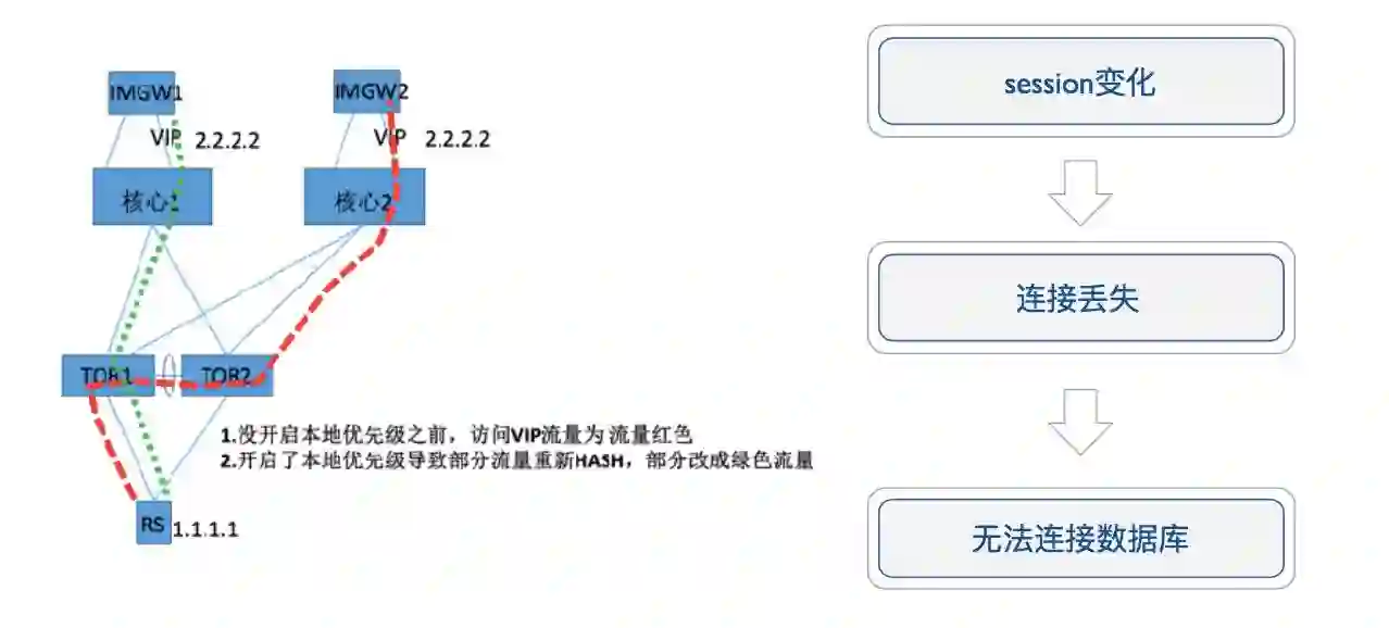③ 隐患。隐患主要针对系统设计存在的一些缺陷,还有一些组件的交叉调用、关键报警的缺失、链路容量不对称等。这类问题是比较难发现的,需要我们深入进行研究。这方面的实例我们可以看下下面这个图,没有操作之前,它的数据包是沿着绿色的线走的,做了操作之后,部分数据包就沿着红色走了。变更前后的主要影响是,红色链路的数据包session发生了变化,因为最初的时候session在IMGW1上,在链路发生变化后,对于TCP有状态的连接,再往后就找不到它后端了,数据包没办法发送过去,这时候数据就丢失掉了,无法连接数据库,这个业务就挂掉了。