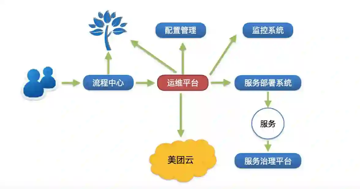 之后云平台会返回到运维平台,运维平台将创建好的机器加到流程中心提供的服务节点下,同时调用配置管理系统对机器进行环境初始化,初始化完成后会自动添加基础监控信息。之后调用部署系统,对服务进行部署。部署之后,服务根据它的服务的标签,最终注册到服务治理平台,然后就能提供线上服务了。相当于只要技术人员发起,整个流程都是能自动完成的。