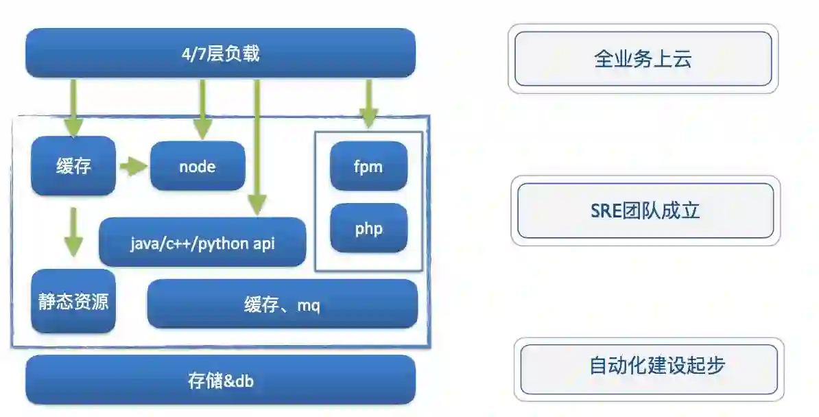 最早期,我们前端是4层负载均衡,静态资源通过Varnish/Squid缓存,动态请求跑在LAMP架构下。这个时候机器很少,需要的流程很少,也没有区分应用运维、系统运维之类的。运维人员也很少,网络、机器和服务都要负责。运维的工作大部分都是靠手工,其实当时还没有成型的运维系统,现在很多初创公司都是这种架构。
