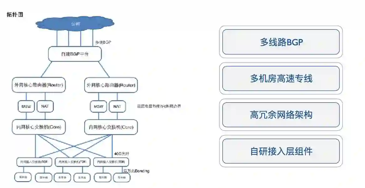 上图是我们云计算基础设施网络相关的架构图,可以看到上面是公网的入口,流量接入大部分都是走的BGP链路。往下是多机房间的高速专线,专线的稳定性经历了线上大规模业务的校验,像外卖、团购、酒旅等,都是做多机房部署的。