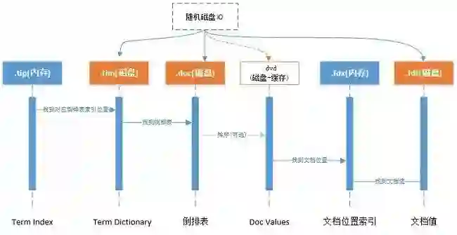Lucene索引文件结构主要的分为词典、倒排表、正向文件、DocValues等,如下图: