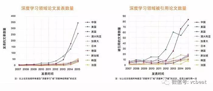 根据美国发布的《国家人工智能研究与发展策略规划》报告中显示,从2013年到2015年,SCI收录的人工智能方向论文,涉及“深度学习”的论文数量增长了约6倍。中国学者的论文发表数量从2014年开始超过美国,并大幅度领先于其他国家。