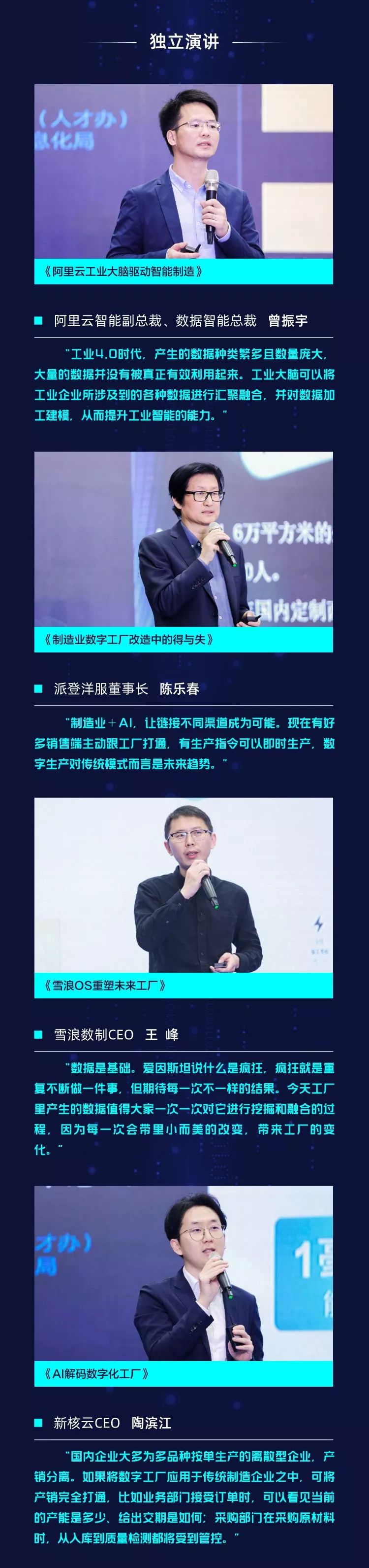 工业巨头布局全产业链,走向技术驱动;互联网先锋凭借应用驱动,横向突破行业壁垒。未来,是属于两者的共谋之路。独立演讲环节,阿里云智能副总裁、数据智能总裁曾震宇、派登洋服董事长陈乐春、雪浪数制CEO王峰和新核云CEO陶滨江就工业大脑、未来工厂、数字车间等话题进行思维碰撞。