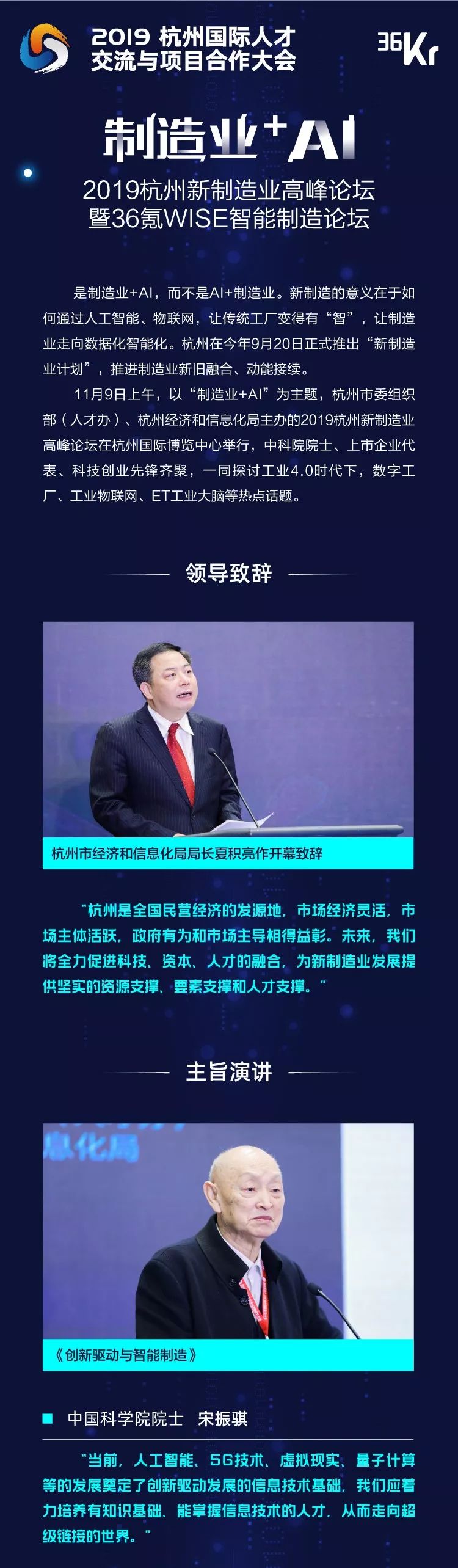 11月9日上午,以“制造业+AI”为主题,杭州市委组织部(人才办)、杭州经济和信息化局主办的2019杭州新制造业高峰论坛在杭州国际博览中心举行,中科院院士、上市企业代表、科技创业先锋齐聚,一同探讨工业4.0时代下,数字工厂、工业物联网、ET工业大脑等热点话题。