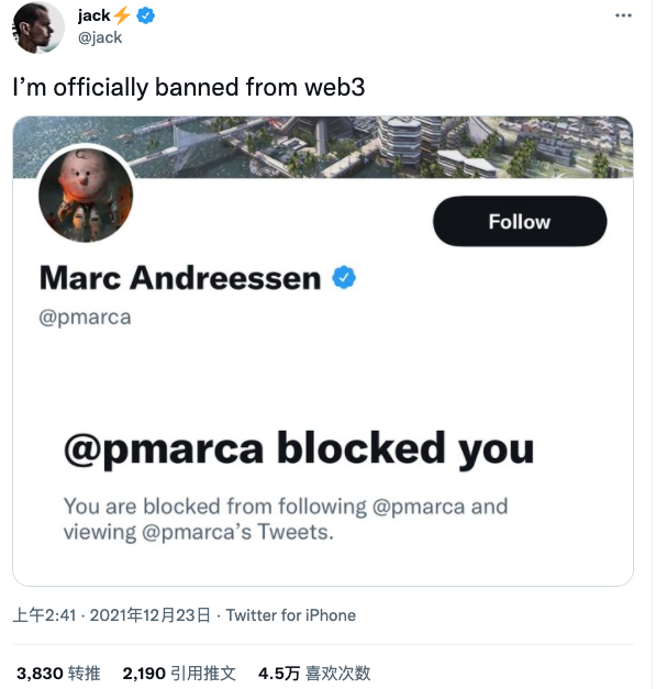 对此,Dorsey截了个图并发推文说 :「我正式被Web3封了」。