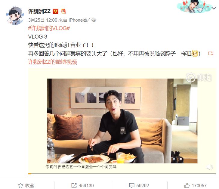 类似的“明星vlog”还有很多,例如,在孙怡5分多钟的视频里,她一边做妆发,打游戏、吃东西,一边回答工作人员的提问;许魏洲曾发布一支50个快问快答的视频,表示自己要疯狂营业,也打上了vlog的标签……