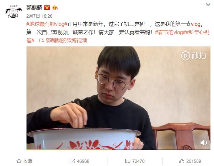 反而一开始就表示自己“被迫营业”的郭麒麟,形成了自己的个人特色。目前发布的三支vlog都在很认真地“敷衍”,不少网友调侃“这伟大的长镜头”“感谢您百忙之中敷衍我们”。
