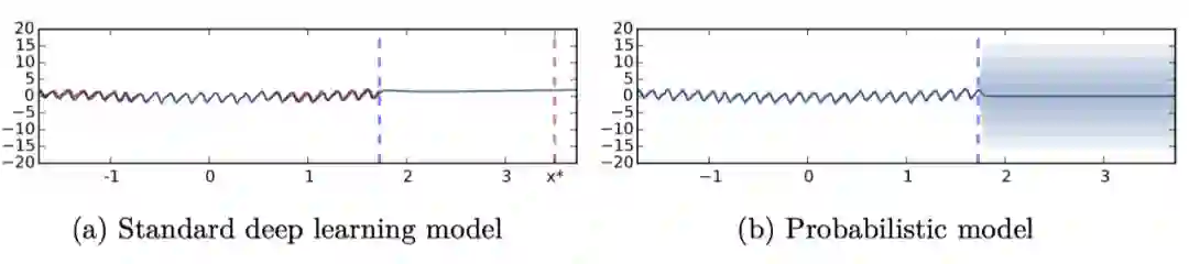 ,传统的深度学习模型会给出确定的预测,如左图红色虚线所示;而概率模型则会对未知的测试部分均采用概率分布来表示,如右图蓝色阴影部分所示,在数据集不能学习到准确的数据分布的情况下(当然实际所用的所有数据集都是有限的),很显然引入不确定性更合理,这也是能有效提升模型泛化能力的原因。