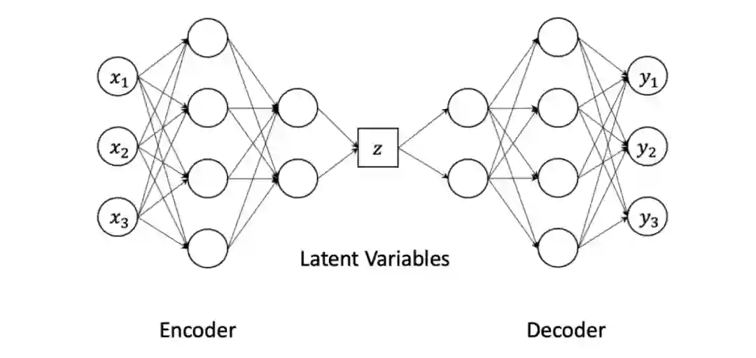 变分自编码器本质上也是贝叶斯深度学习,只不过这次是对隐变量(Latent Variables)进行不确定性建模,也就是将神经网络中的隐藏层输出视作随机变量。传统自编码器是一种由编码器和解码器组成的用于特征提取或数据降维的模型。如下图所示左边是编码器,右边是解码器,通过自编码器将输